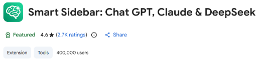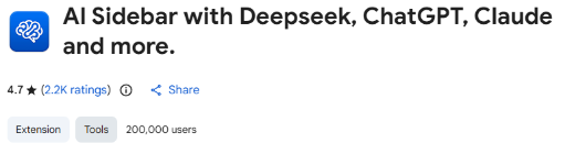 - AI Sidebar with Deepseek, ChatGPT, Claude, and more - Version: 1.6.1 - with over 200,000 users (ID: inhcgfpbfdjbjogdfjbclgolkmhnooop)