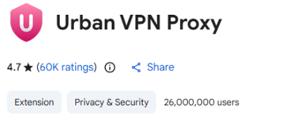 - Urban VPN Proxy - Version: 5.11.6 - with over 26,000,000 users (ID: eppiocemhmnlbhjplcgkofciiegomcon)